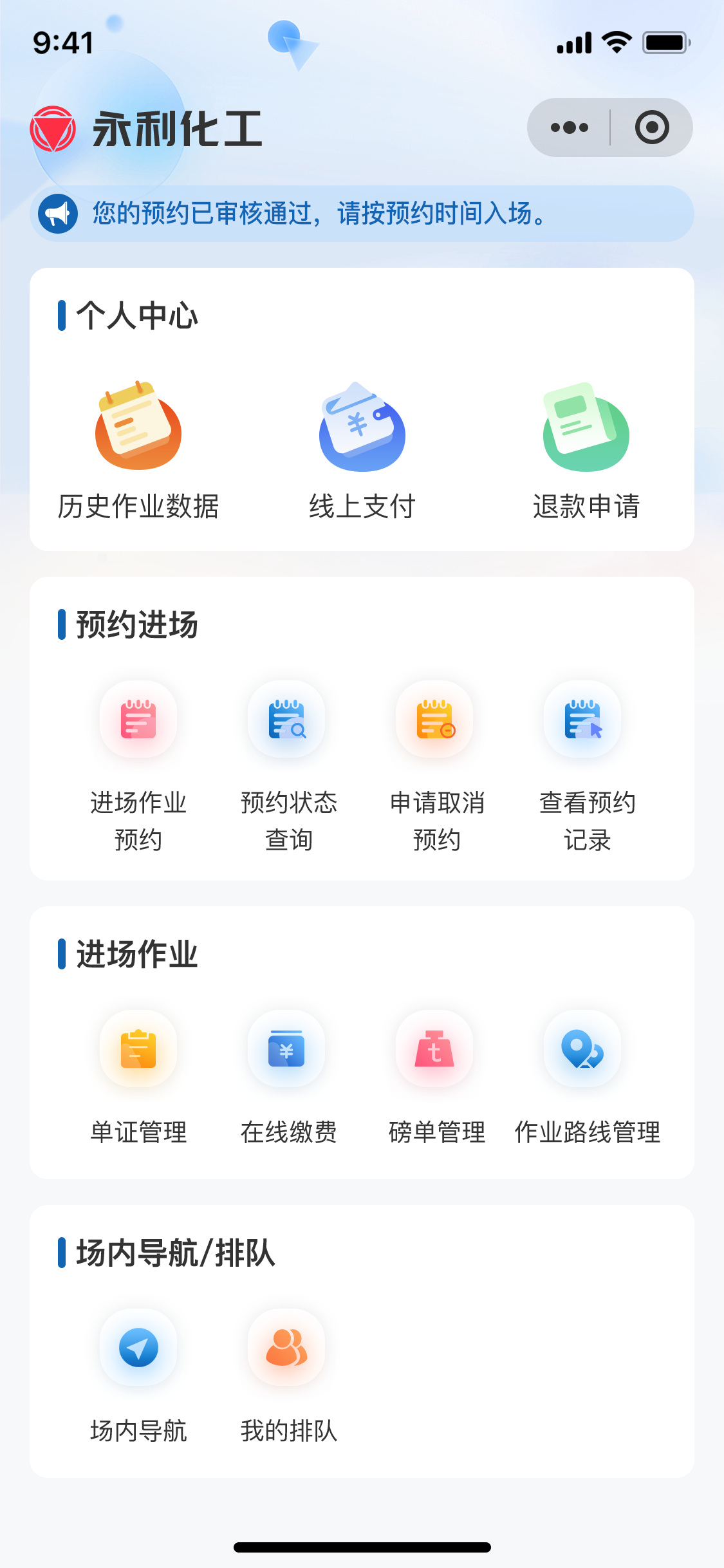 hth官方网页入口(司机端)APP,天津渤化hth官方网页入口股份有限公司业务预约系统的重要组成部分,主要为货物采购与销售业务提供车辆预约服务,为司机提供了优质便捷的体验。 司机在hth官方网页入口(司机端)APP上对订单进行在线预约,到达企业区域后可进行申请排队进场操作,场区设备识别车辆后自动放行车辆,完成作业后,司机可在app上查询历史作业数据。
