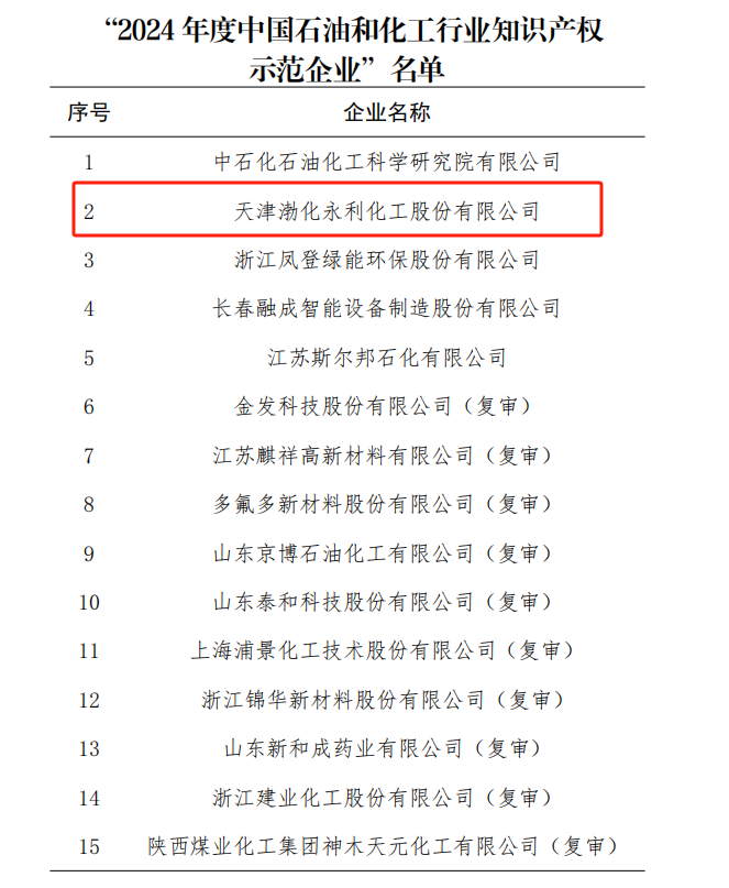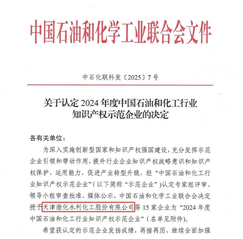 日前,中国石油和化学工业联合会正式公布了《关于认定2024年度中国石油和化工行业知识产权示范企业的决定》,天津渤化hth官方网页入口股份有限公司成功入选,成为2024年度全国15家获此殊荣的企业之一。