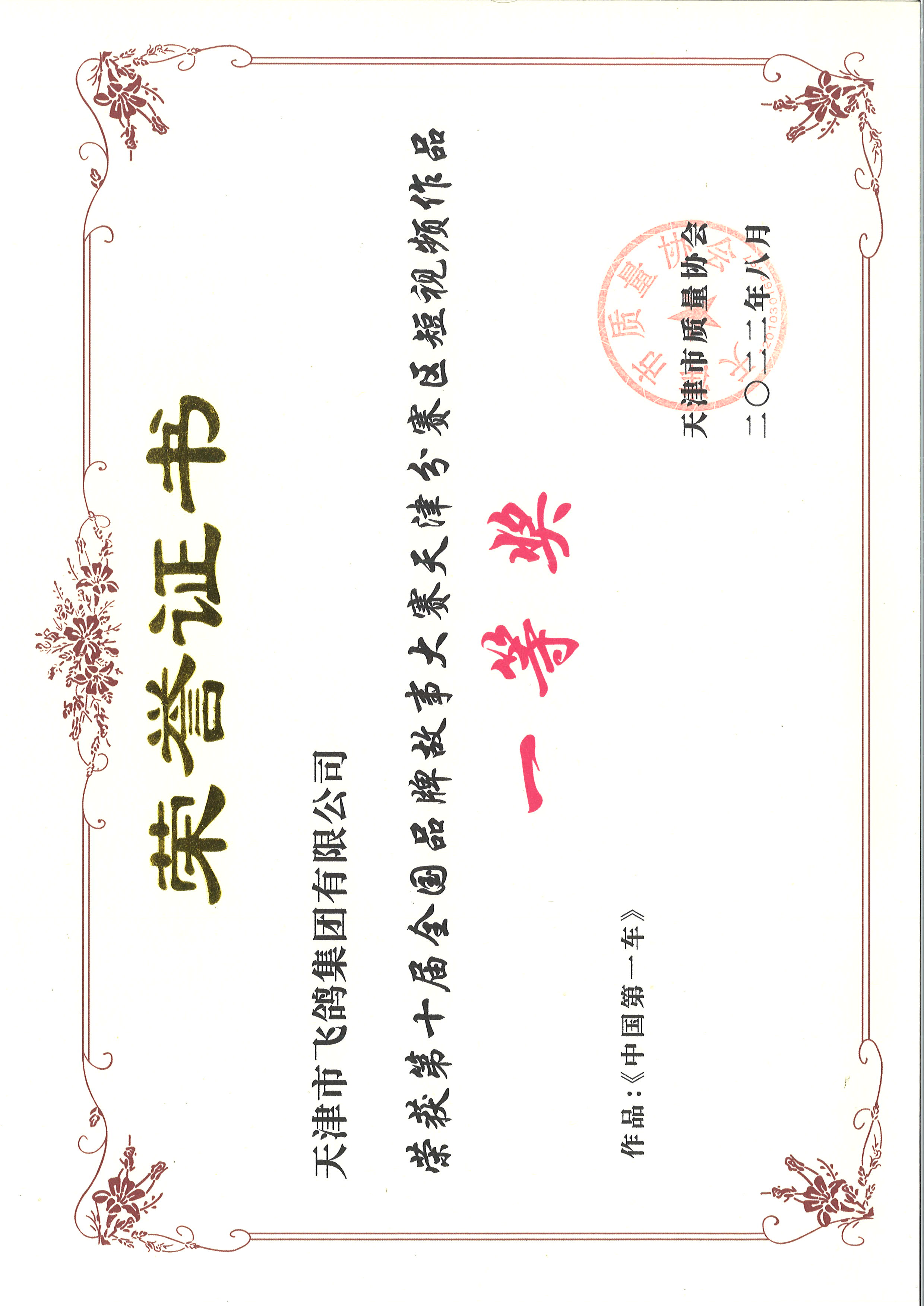 飞鸽集团报送的《中国第一车》获评短视频作品一等奖,将代表天津参加全国品牌故事短视频大赛角逐。